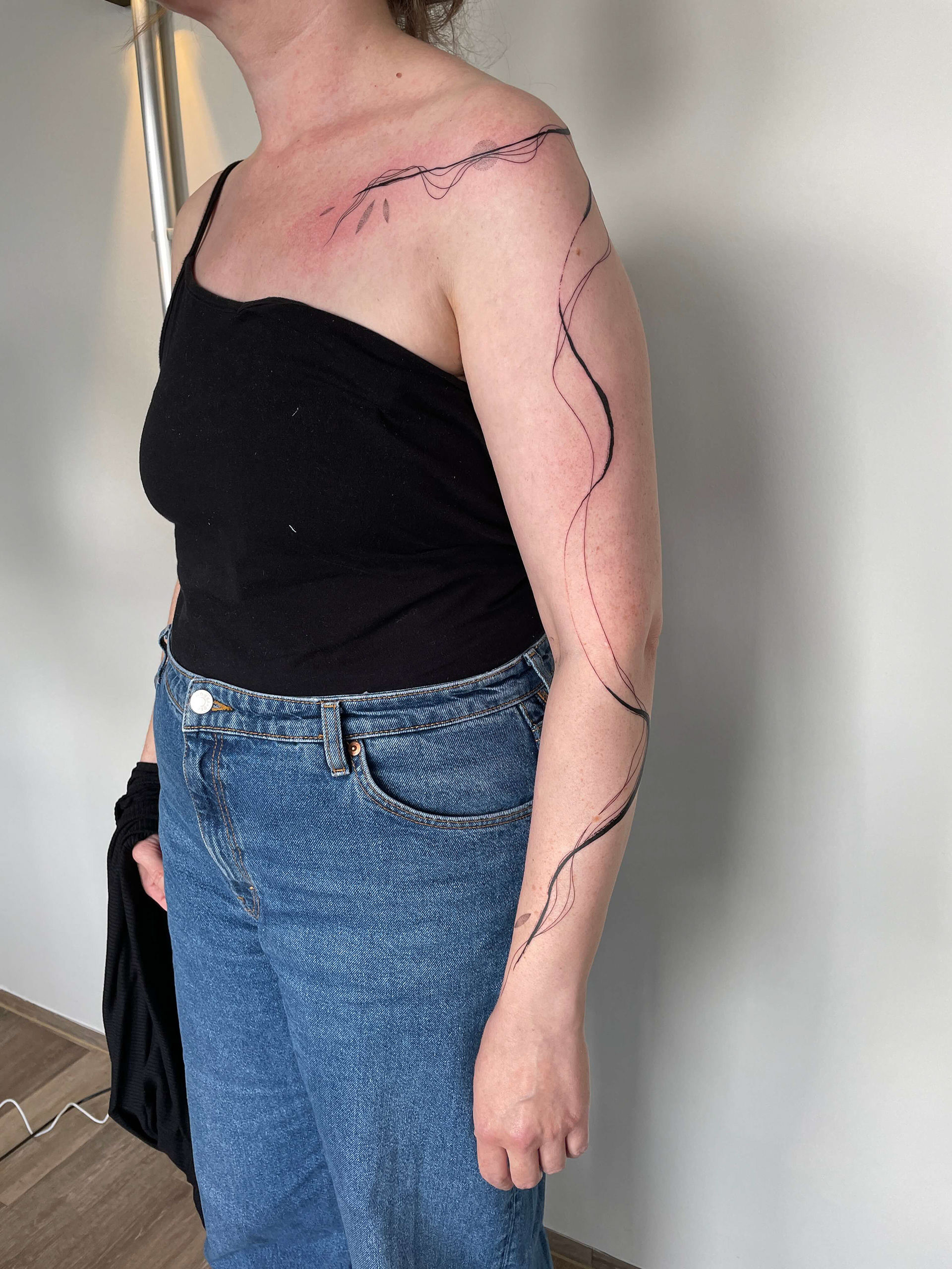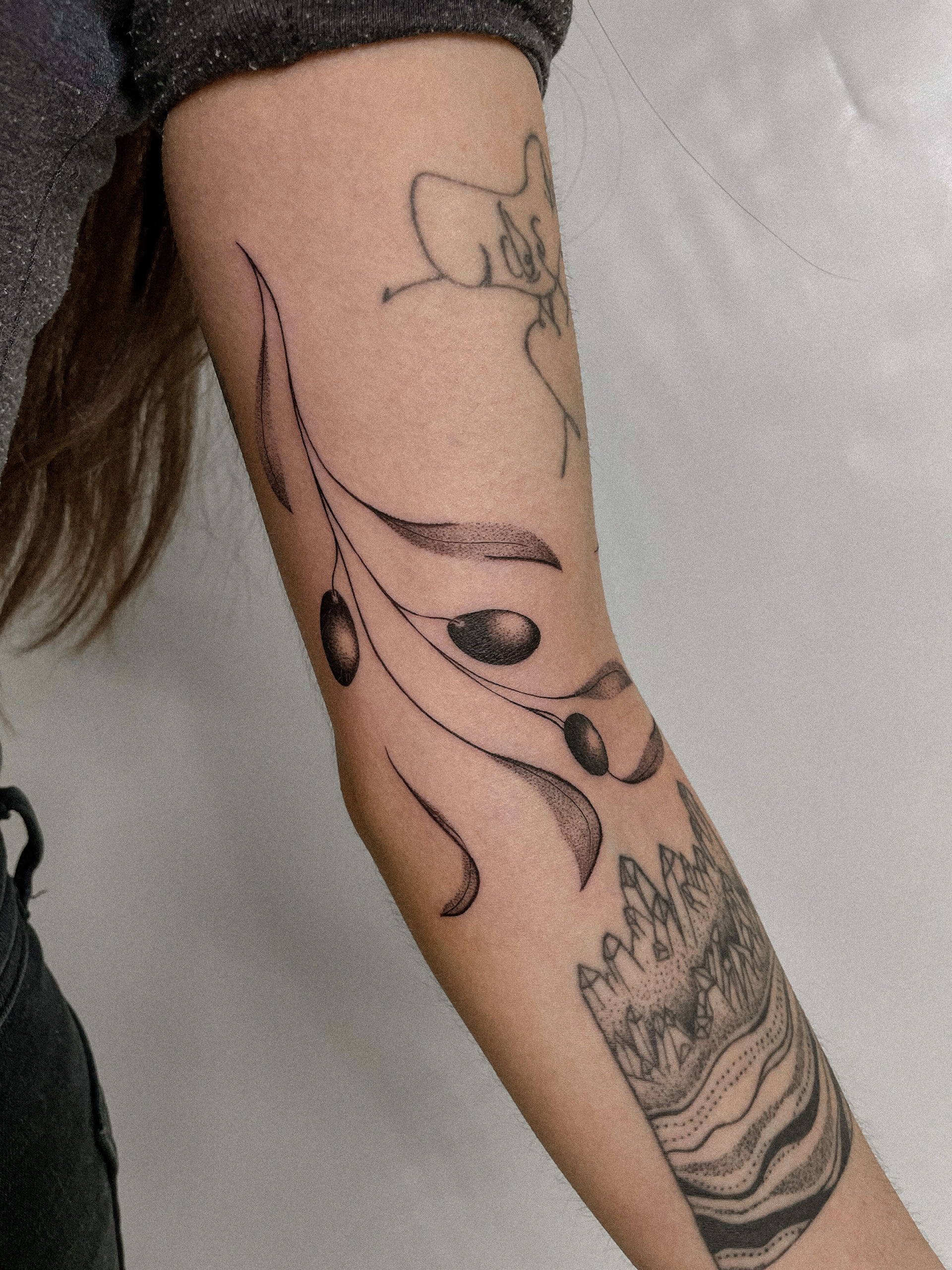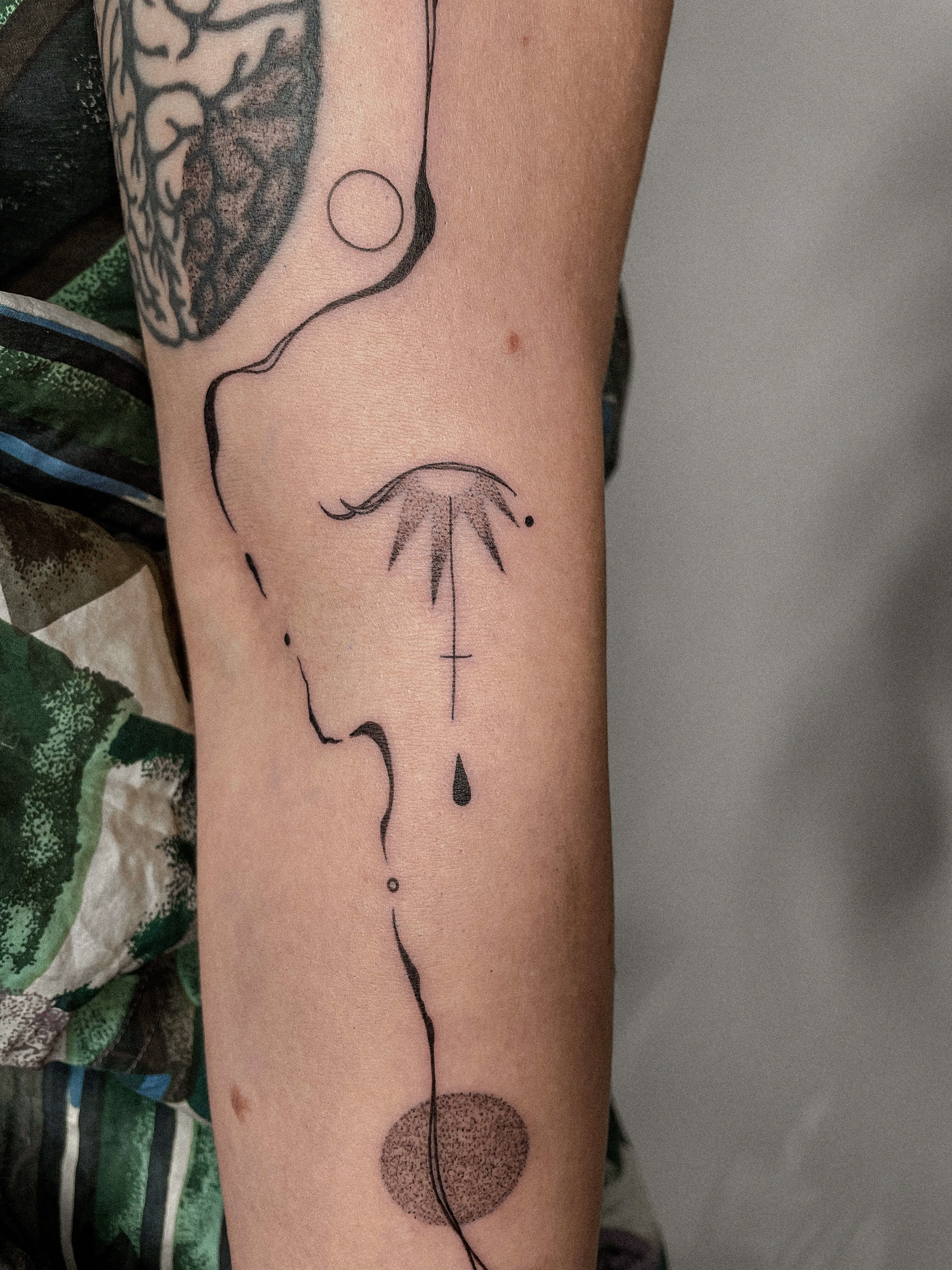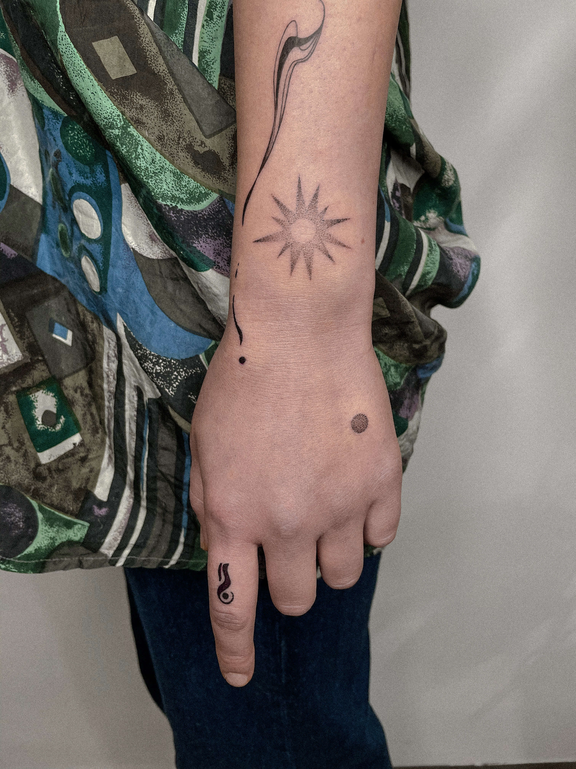 Hier seht ihr eine Auswahl an unterschiedlichen Stilrichtungen. Ich kann meine Arbeit in drei grobe Stilrichtungen einteilen, das sind folgende: Oneliner und Linework: Designs aus einer Linie ohne Schattierung, Fineline: Detaillierte Designs mit zarter und/ oder starker Schattierung, Fusion: Surrealistische Designs mit schwarzen Flächen, grafisch, verträumt, Dotwork.